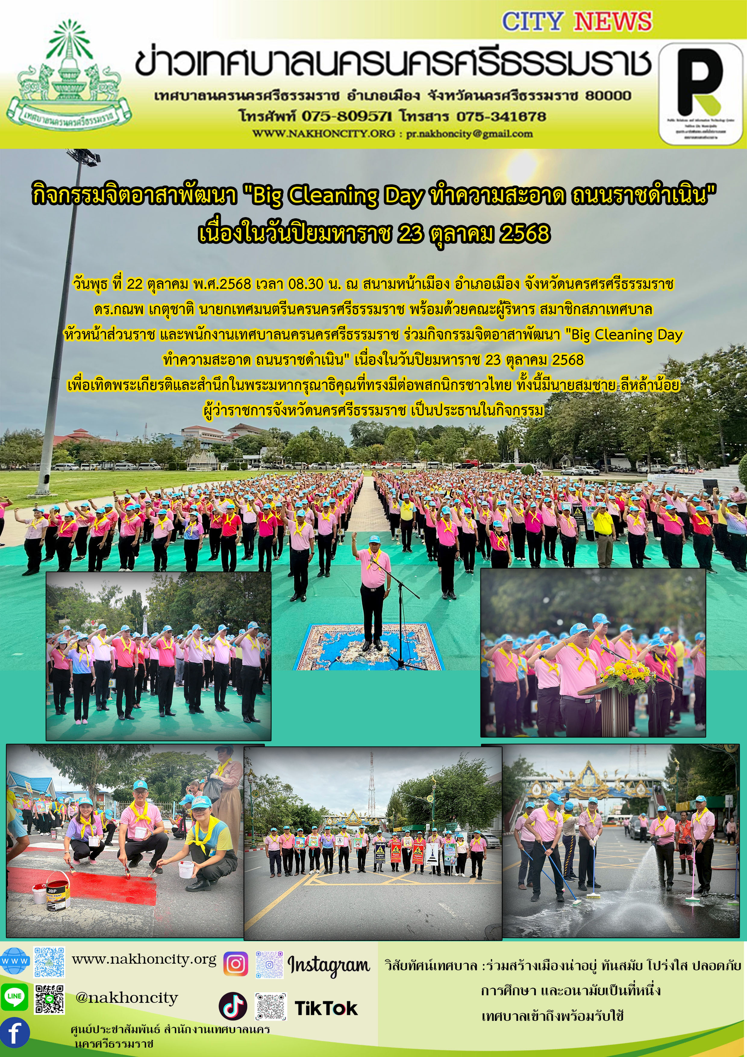 นายกเทศมนตรีนครนครศรีธรรมราช พร้อมด้วยคณะผู้ริหาร สมาชิกสภาเทศบาล หัวหน้าส่วนราช และพนักงานเทศบาลนครนครศรีธรรมราช ร่วมกิจกรรมจิตอาสาพัฒนา "Big Cleaning Day ทำความสะอาด ถนนราชดำเนิน" เนื่องในวันปิยมหาราช 23 ตุลาคม 2568 |