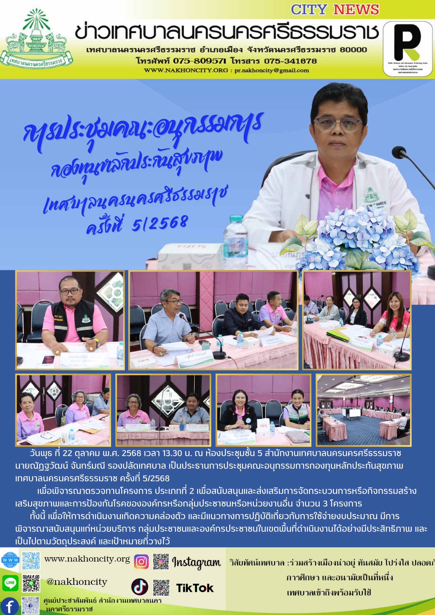 นายณัฏฐวัฒน์ จันทร์มณี รองปลัดเทศบาล เป็นประธานการประชุมคณะอนุกรรมการกองทุนหลักประกันสุขภาพเทศบาลนครนครศรีธรรมราช ครั้งที่ 5/2568 |