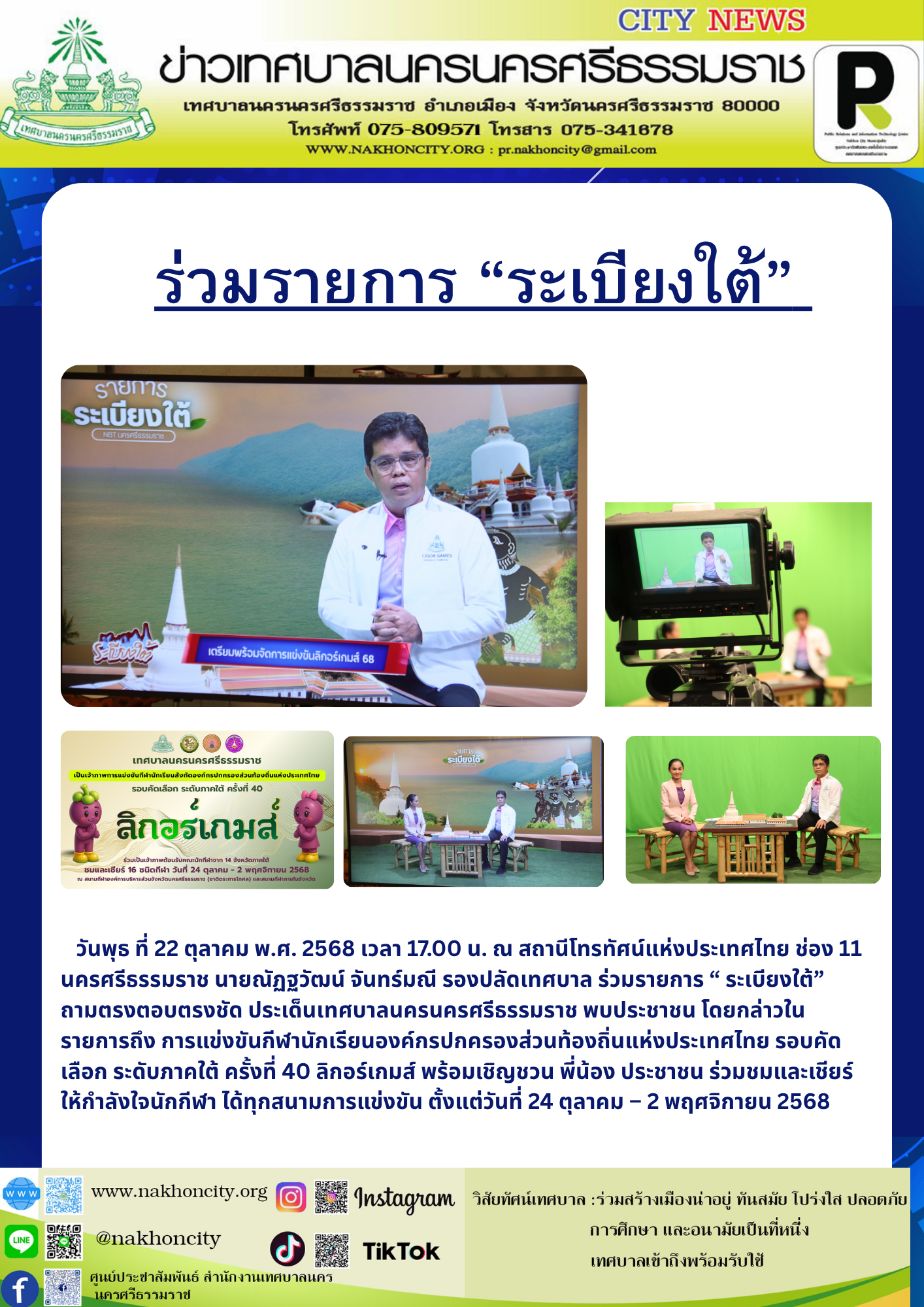 วันพุธ ที่ 22 ตุลาคม พ.ศ. 2568 เวลา 17.00 น. ณ สถานีโทรทัศน์แห่งประเทศไทย ช่อง 11 นครศรีธรรมราช นายณัฏฐวัฒน์ จันทร์มณี รองปลัดเทศบาล ร่วมรายการ “ ระเบียงใต้” ถามตรงตอบตรงชัด ประเด็นเทศบาลนครนครศรีธรรมราช พบประชาชน โดยกล่าวในรายการถึง การแข่งขันกีฬานักเรียนองค์กรปกครองส่วนท้องถิ่นแห่งประเทศไทย รอบคัดเลือก ระดับภาคใต้ ครั้งที่ 40 ลิกอร์เกมส์ พร้อมเชิญชวน พี่น้อง ประชาชน ร่วมชมและเชียร์ ให้กำลังใจนักกีฬา ได้ทุกสนามการแข่งขัน ตั้งแต่วันที่ 24 ตุลาคม – 2 พฤศจิกายน 2568 |
